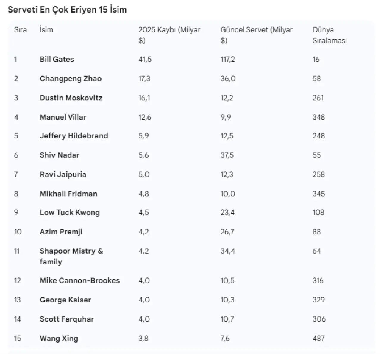 Listenin başında, 2025 yılında servetinden tam 41,5 milyar dolar kaybeden Bill Gates yer alıyor. Gates, yaşadığı bu devasa erimeye rağmen 117,2 milyar dolarlık servetiyle genel sıralamada 16. basamakta tutunmayı başardı.