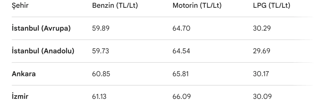 İstanbul, Ankara ve İzmir'de benzin, motorin ve LPG litre fiyatları şu şekildedir:0