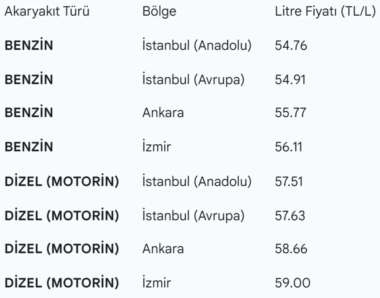 Zam öncesindeki güncel akaryakıt (benzin ve dizel/motorin) fiyatları büyük şehirlerde şu şekilde listelenmiştir: