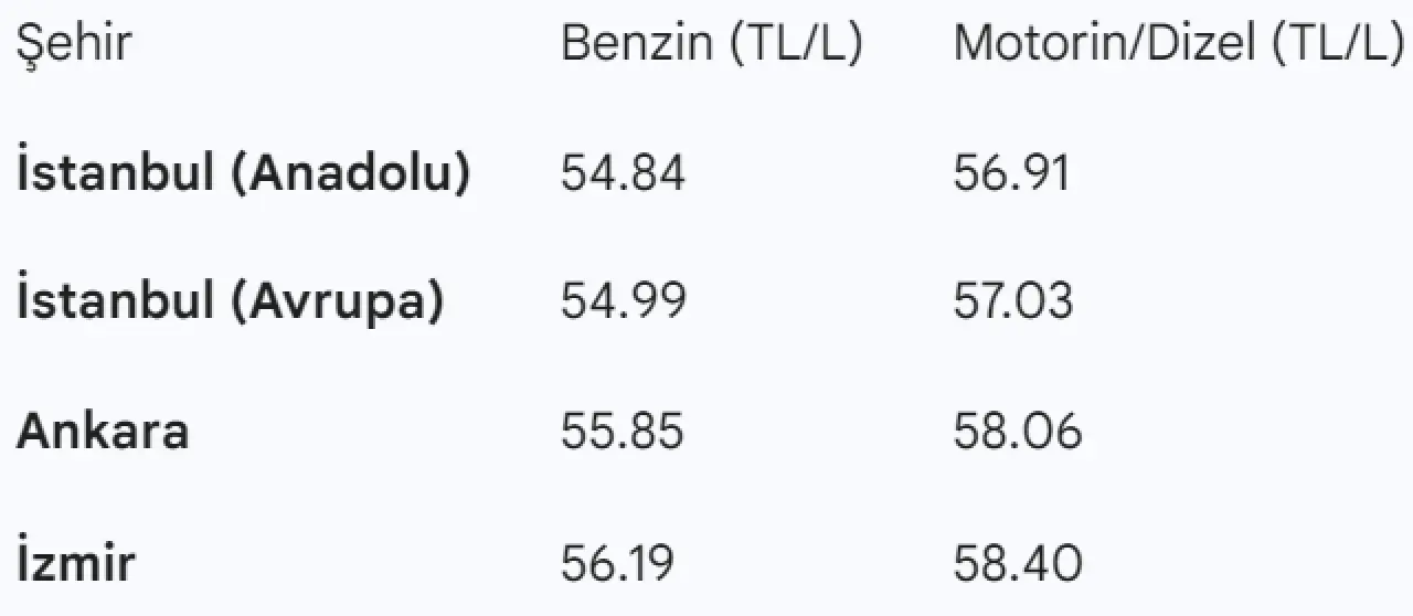 Cuma günü gerçekleşecek indirim öncesindeki, 26 Kasım 2025 tarihi itibarıyla büyük şehirlerdeki güncel akaryakıt pompa fiyatları şöyle:
