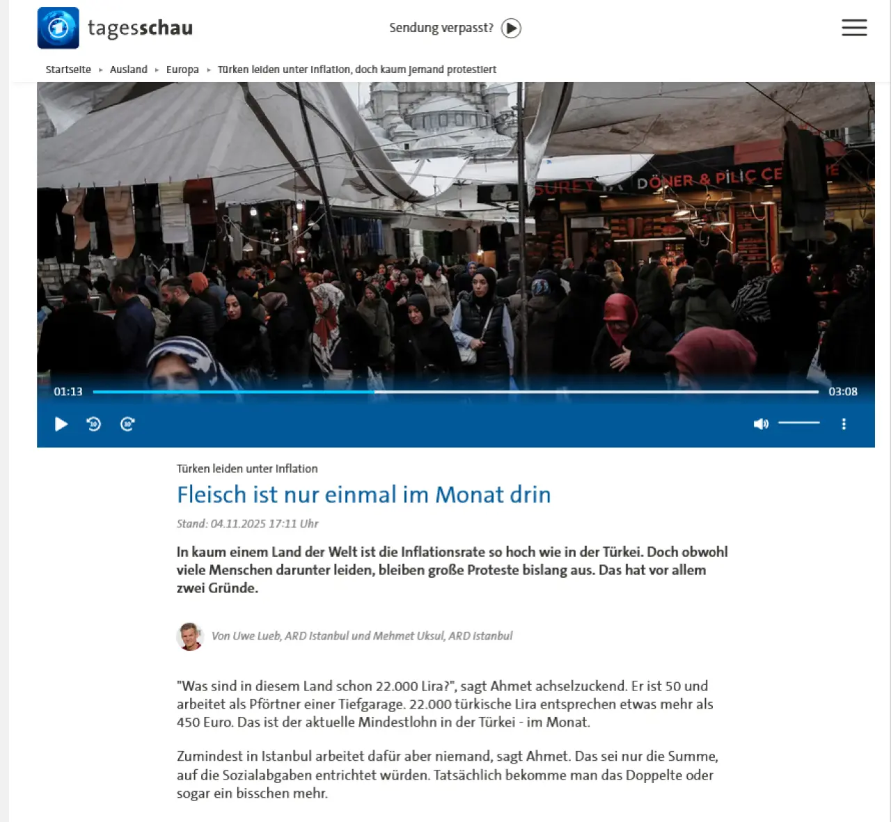Tagesschau'nun "Ayda bir kez et yiyebilen aileler: Türkiye’de yoksulluk sessiz derinleşiyor" başlıklı haberi, Türkiye'deki ekonomik krizin boyutunu gözler önüne serdi. Haberde, Türkiye'nin dünyanın en yüksek enflasyon oranlarından birine sahip olduğu belirtilirken, TÜİK tarafından açıklanan resmi enflasyonun (Ekim 2025 itibarıyla yıllık yüzde 32,87) uzmanlar tarafından gerçek rakamın çok altında olduğu görüşüne yer verildi. (Bağımsız kuruluşlar bu oranın çok daha yüksek olduğunu ifade ediyor.)