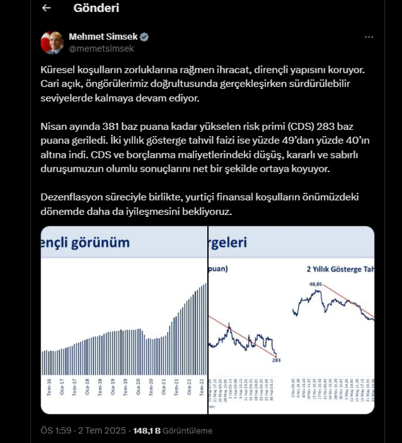 Mehmet Şimşek, nisan ayında 381 baz puana kadar yükselen risk priminin haziran sonunda 283 baz puana gerilediğini açıkladı. Ayrıca, iki yıllık gösterge tahvil faizinin de yüzde 49'dan yüzde 40'ın altına indiğini belirtti.