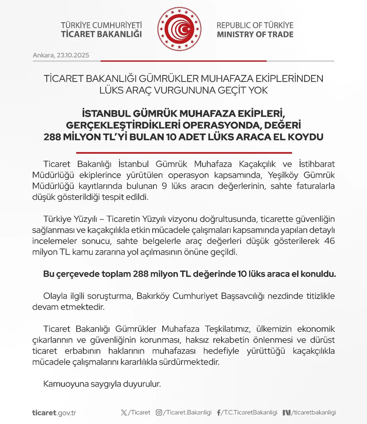 Ticaret Bakanlığı Gümrük Muhafaza Kaçakçılık ve İstihbarat Müdürlüğü ekiplerince yürütülen başarılı bir operasyonla, Türkiye ekonomisine büyük zarar verecek bir kaçakçılık girişiminin önüne geçildi. Yeşilköy Gümrük Müdürlüğü kayıtlarında bulunan 9 lüks aracın değerlerinin, sahte faturalar kullanılarak gerçeğinden oldukça düşük gösterildiği tespit edildi.