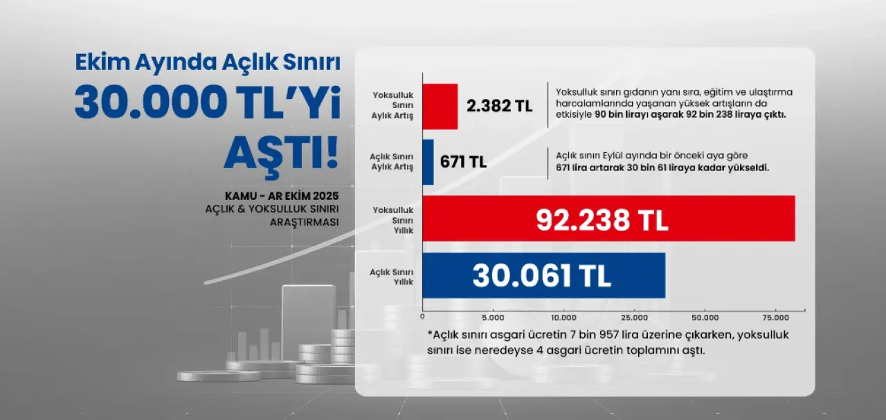 Aynı dönemde, gıda dışındaki barınma, giyim, eğitim, sağlık ve ulaşım gibi zorunlu ihtiyaçları da karşılayarak "insan onuruna yaraşır bir yaşam" sürme maliyetini belirten yoksulluk sınırı ise 92.238 liraya ulaştı. Yoksulluk sınırındaki bu devasa artış, dört asgari ücretin (88.416 TL) bile geçim için yetersiz kaldığını ortaya koydu.