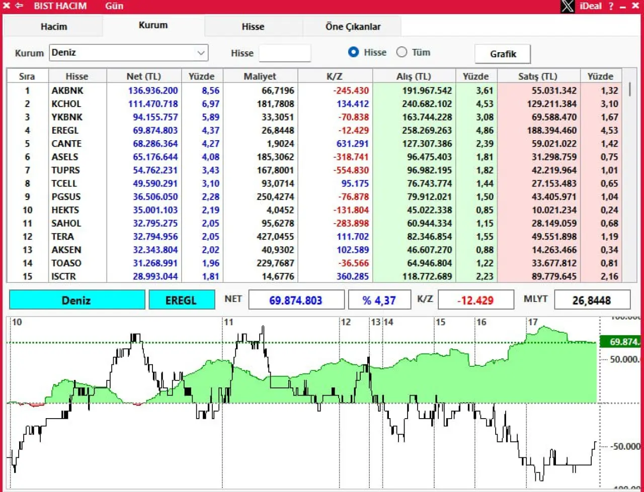 Deniz Yatırım’ın alım yaptığı hisselerde AKBNK (136,9 milyon TL), KCHOL (111,4 milyon TL) ve YKB (94,1 milyon TL) öne çıkarken; EREGL hissesinde de 69,8 milyon TL net alım yaptı. Ancak hisse kapanışa doğru kâr satışlarıyla karşılaştı. Teknik olarak 26,84 TL ortalama maliyet seviyesinin altında kapanış yapan hissede sonraki haftaya yönelik beklenti, kurumsal alımın devam edip etmeyeceğiyle şekillenecek.