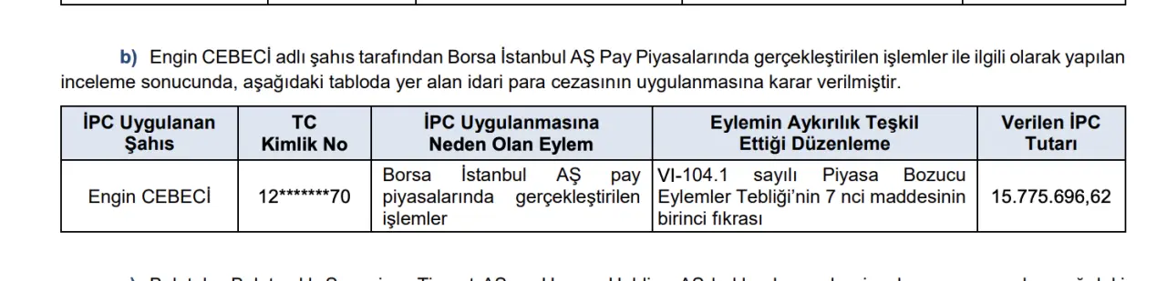 Borsa İstanbul pay piyasalarında gerçekleştirilen işlemler nedeniyle Engin Cebeci hakkında 15.775.696,62 TL tutarında idari para cezası uygulanmasına karar verildi. Söz konusu yaptırımın, VI-104.1 sayılı Piyasa Bozucu Eylemler Tebliği’nin 7’nci maddesi kapsamında verildiği resmi kayıtlara yansıdı. Uygulanan cezanın, herhangi bir adli kara olmadığı, idari nitelikte bir yaptırım olduğu özellikle belirtiliyor.