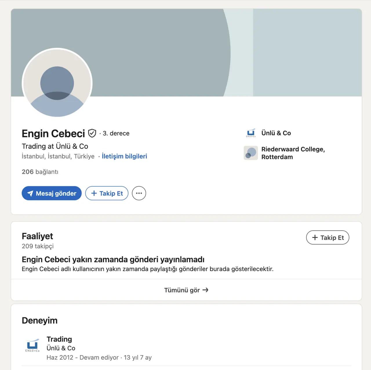 Kamuoyunda dikkat çeken bir diğer detay ise, Engin Cebeci’nin LinkedIn adlı sosyal paylaşım platformundaki herkese açık profilinde Ünlü & Co bünyesinde çalışıyor olarak görünmesi oldu. Ancak bu bilginin yalnızca kişinin kendi beyanına dayalı açık kaynak niteliğinde olduğu, söz konusu kurum tarafından konuya ilişkin resmî bir açıklama yapılmadığı ve bu nedenle kurumsal bir bağın doğrulanmış bir bilgi olmadığı vurgulanıyor.