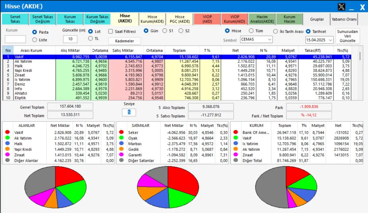Bu sayfada, 15 Nisan 2025 tarihli CEMAS hisse anlık kademe dağılımı verilerini bulabilirsiniz.
