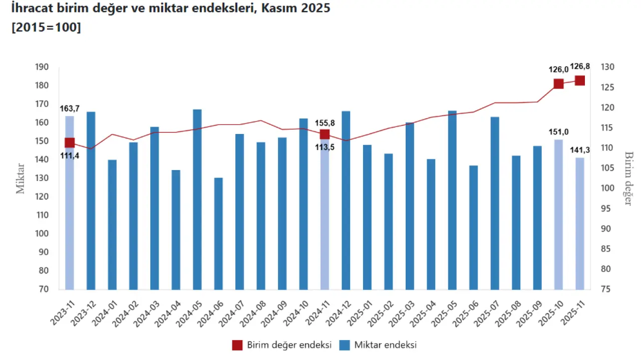 Türkiye İstatistik Kurumu (TÜİK), Kasım 2025 dönemine ilişkin dış ticaret endeksleri verilerini açıkladı. Verilere göre, ihracat birim değer endeksi bir önceki yılın aynı ayına göre yüzde 11,7 oranında artış gösterirken, ihracat miktar endeksinde gerileme kaydedildi. Dış ticaret haddi ise geçen yılın aynı dönemine göre 8 puan yükselerek 92,8 seviyesine ulaştı.