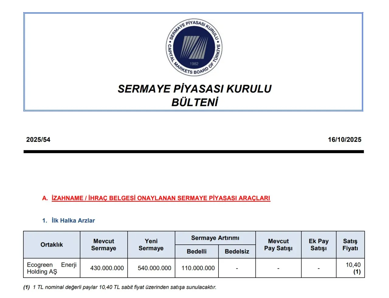Güneşten biyogaza, biyokütleden organik gübreye uzanan çevreci yatırımlarıyla dikkat çeken EcoGreen Enerji Holding A.Ş., Sermaye Piyasası Kurulu’ndan halka arz onayını aldı. Şirket, 10,40 TL sabit fiyatla yatırımcılarla buluşacak ve halka arz gelirini yeni enerji projelerinde değerlendirecek.