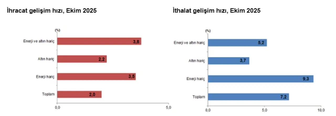2025 Ekim ayında, bir önceki yılın aynı dönemine kıyasla ihracat yüzde 2,0 artışla 23 milyar 941 milyon dolar seviyesine yükseldi. İthalat ise daha hızlı bir büyüme sergileyerek yüzde 7,2 artışla 31 milyar 521 milyon dolar olarak gerçekleşti.