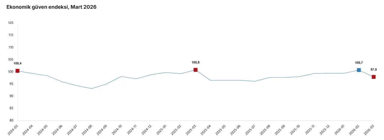 Türkiye İstatistik Kurumu (TÜİK), 2026 yılı Mart ayına ilişkin Ekonomik Güven Endeksi verilerini açıkladı. Şubat ayında 100,7 seviyesinde olan endeks, Mart ayında bir önceki aya göre yüzde 2,8 oranında azalarak 97,9 değerine düştü.