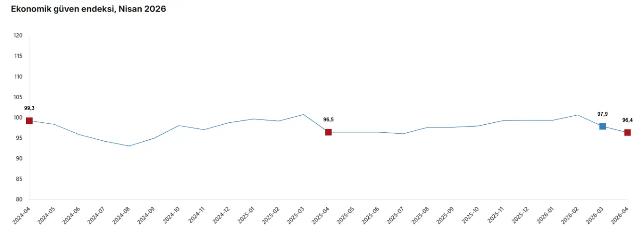 Türkiye İstatistik Kurumu (TÜİK) tarafından açıklanan verilere göre, ekonomik güven endeksi 2026 yılı Nisan ayında bir önceki aya göre yüzde 1,5 oranında azalarak 96,4 değerine düştü. Mart ayında 97,9 seviyesinde olan endeksteki bu düşüş, reel kesim, hizmet ve perakende ticaret sektörlerindeki gerilemeden kaynaklandı.