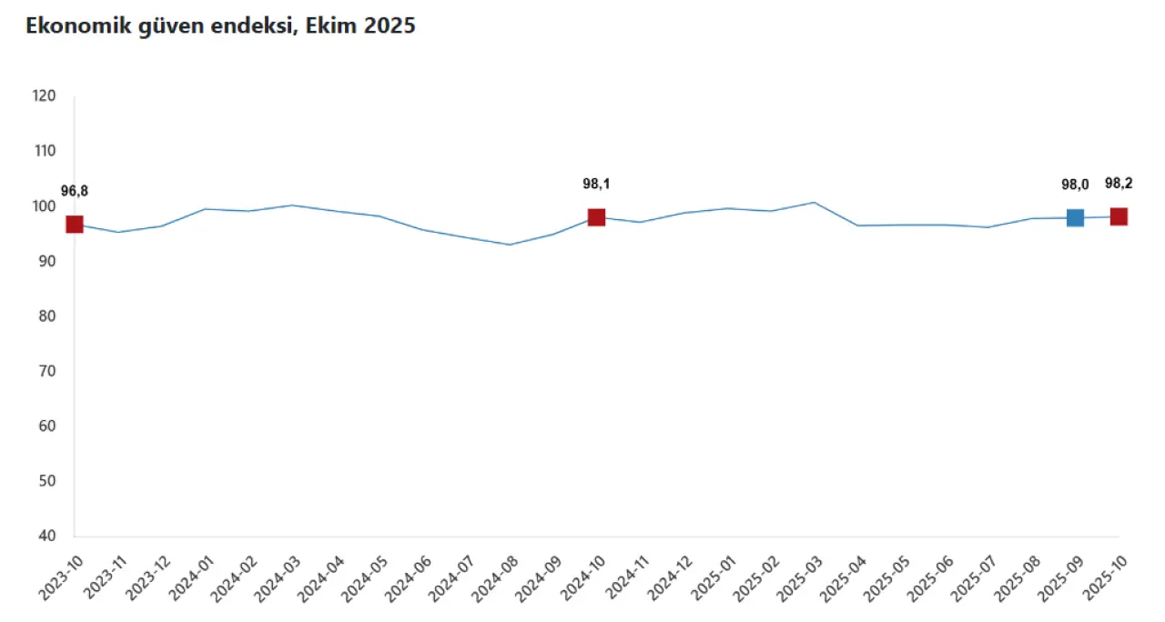 Türkiye İstatistik Kurumu (TÜİK) tarafından açıklanan Ekonomik Güven Endeksi (EGE), Ekim 2025 verilerine göre bir önceki aya kıyasla yüzde 0,3 oranında artış göstererek 98,2 seviyesine ulaştı. Eylül ayında 98,0 olan endeks, son verilerle sınırlı bir yükseliş kaydetmiş oldu.