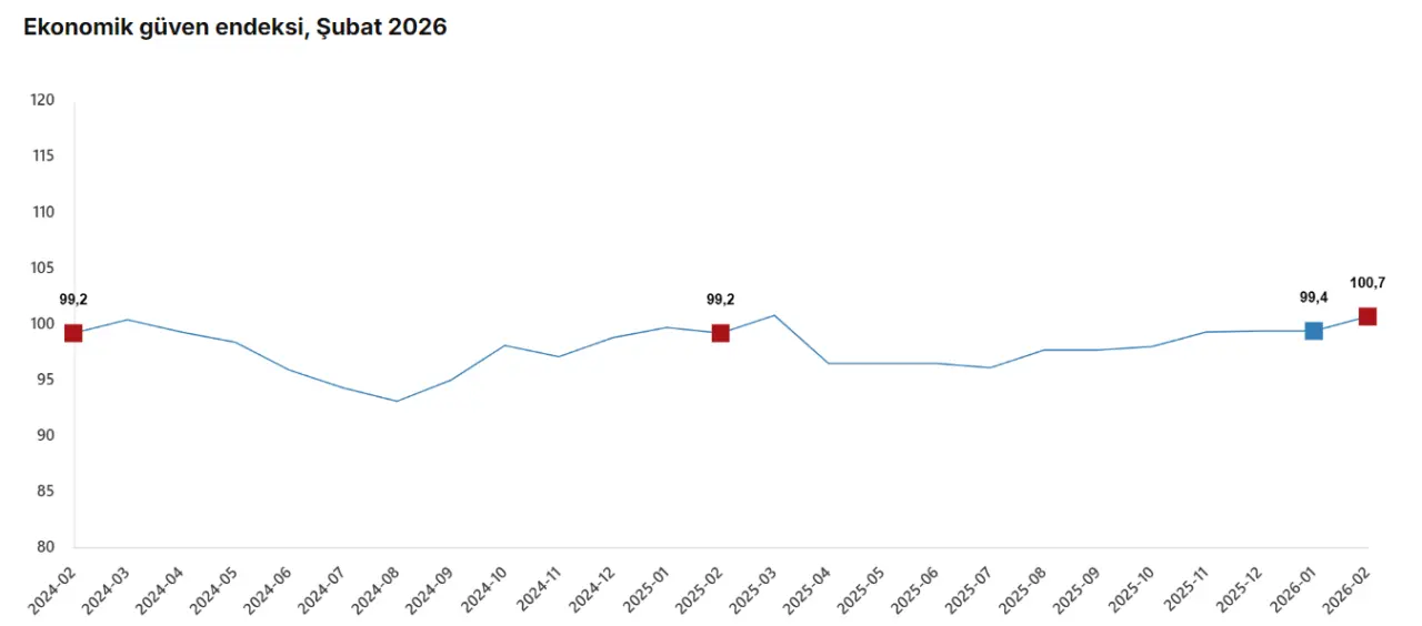 Türkiye İstatistik Kurumu (TÜİK) tarafından açıklanan verilere göre, Ekonomik Güven Endeksi Şubat 2026 döneminde bir önceki aya göre yüzde 1,4 oranında artış göstererek 100,7 değerini aldı. Ocak ayında 99,4 seviyesinde olan endeksin 100 eşik değerinin üzerine çıkması, genel ekonomik duruma dair iyimserliğin arttığına işaret etti.