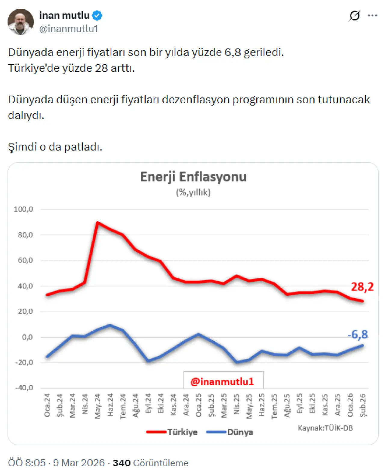 Ekonomi analisti İnan Mutlu, TÜİK ve Dünya Bankası verilerini mercek altına alarak enerji enflasyonundaki zıt tabloyu gözler önüne serdi. Paylaşılan güncel analize göre, dünya genelinde enerji fiyatları son bir yılda yüzde 6,8 oranında gerilerken, Türkiye’de enerji maliyetleri yüzde 28,2 oranında artış kaydetti.