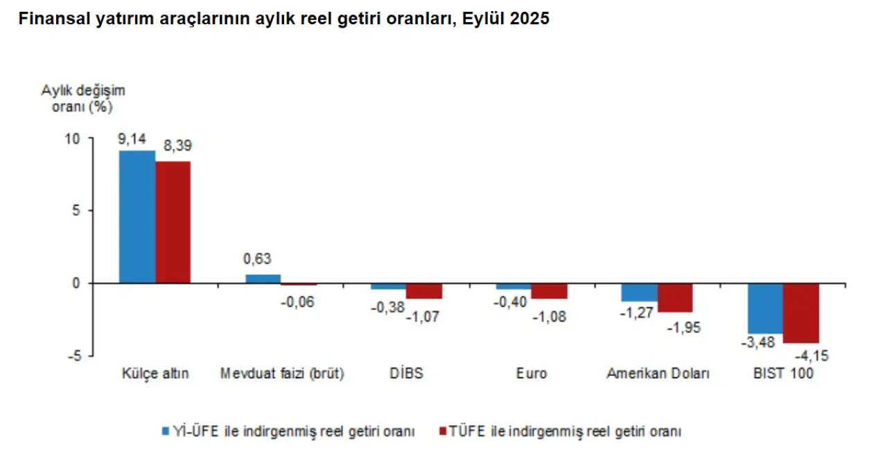Eylül 2025 dönemine ait finansal yatırım araçlarının reel getiri oranları açıklandı. Türkiye İstatistik Kurumu (TÜİK) verilerine göre, aylık bazda en yüksek reel getiri külçe altında gerçekleşti.