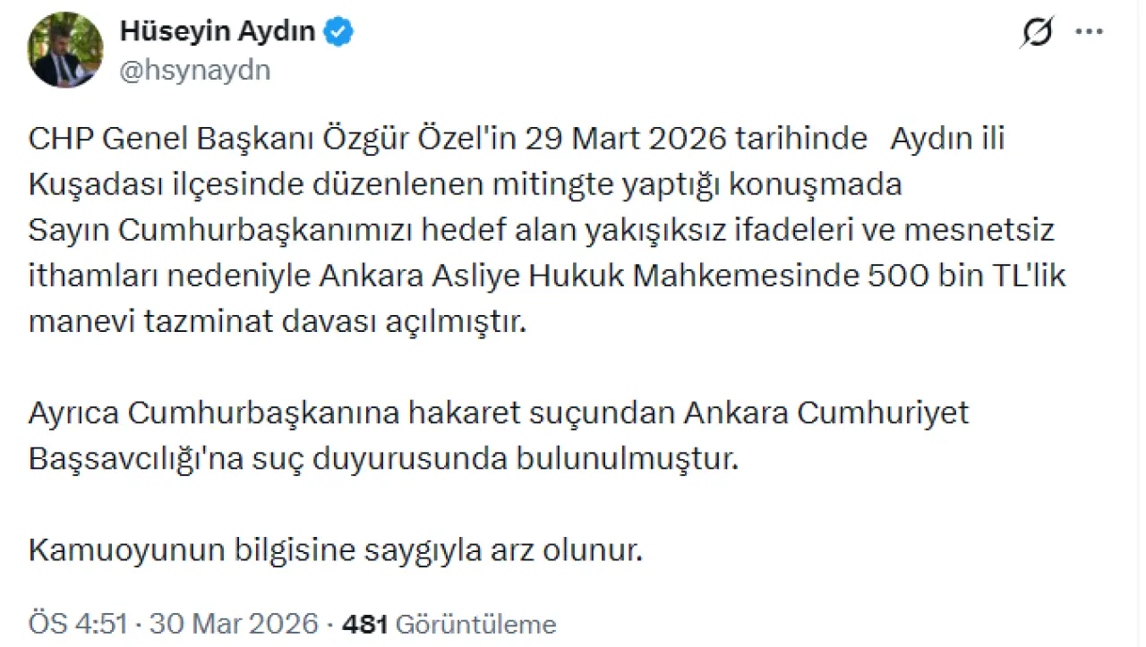Cumhurbaşkanı Recep Tayyip Erdoğan'ın avukatı Hüseyin Aydın, sosyal medya hesabı üzerinden yaptığı açıklamada, CHP Genel Başkanı Özgür Özel'e yönelik hukuki süreç başlatıldığını duyurdu. Aydın, davanın gerekçesi olarak Özel'in 29 Mart 2026 tarihinde Aydın'ın Kuşadası ilçesinde gerçekleştirdiği mitingdeki konuşmasını gösterdi.