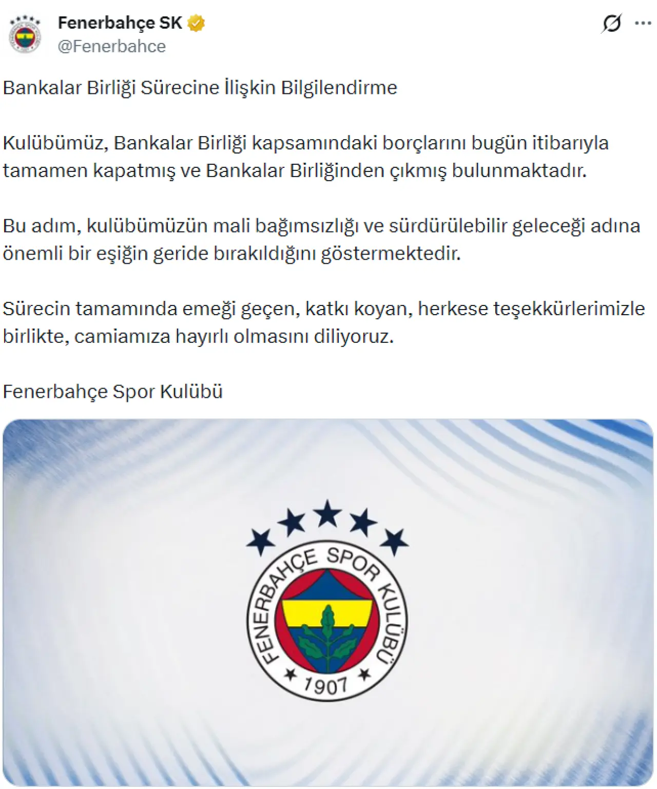 "Kulübümüz, Bankalar Birliği kapsamındaki borçlarını bugün itibarıyla tamamen kapatmış ve Bankalar Birliği'nden çıkmış bulunmaktadır. Bu adım, kulübümüzün mali bağımsızlığı adına önemli bir eşiğin geride bırakıldığını göstermektedir. Süreçte emeği geçen herkese teşekkürlerimizi sunuyoruz."