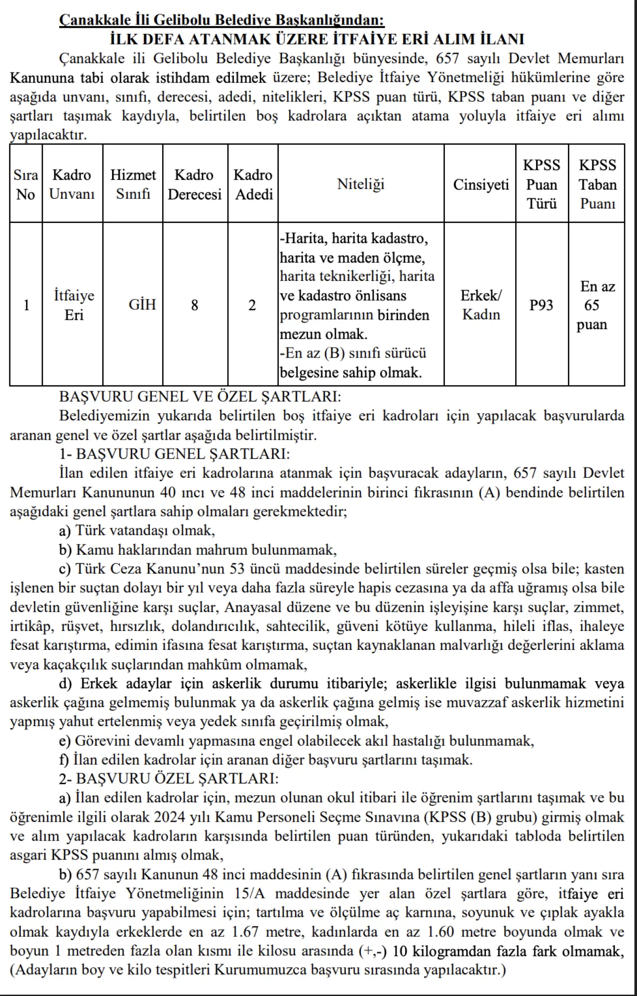 Çanakkale ili Gelibolu Belediye Başkanlığı, 657 sayılı Devlet Memurları Kanunu'na tabi olarak istihdam edilmek üzere iki (2) adet itfaiye eri alımı yapacağını duyurdu. Adaylar, Belediye İtfaiye Yönetmeliği kapsamında belirlenen genel ve özel şartları sağlamaları koşuluyla başvuruda bulunabilecek.