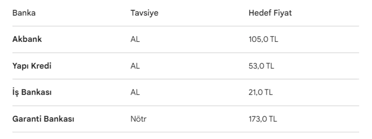 Goldman Sachs, raporunda Türk bankaları için tavsiye ve hedef fiyatlarını da paylaştı. Akbank, Yapı Kredi ve İş Bankası için "AL" tavsiyesi verilirken, Garanti Bankası için "Nötr" görüşü korundu.