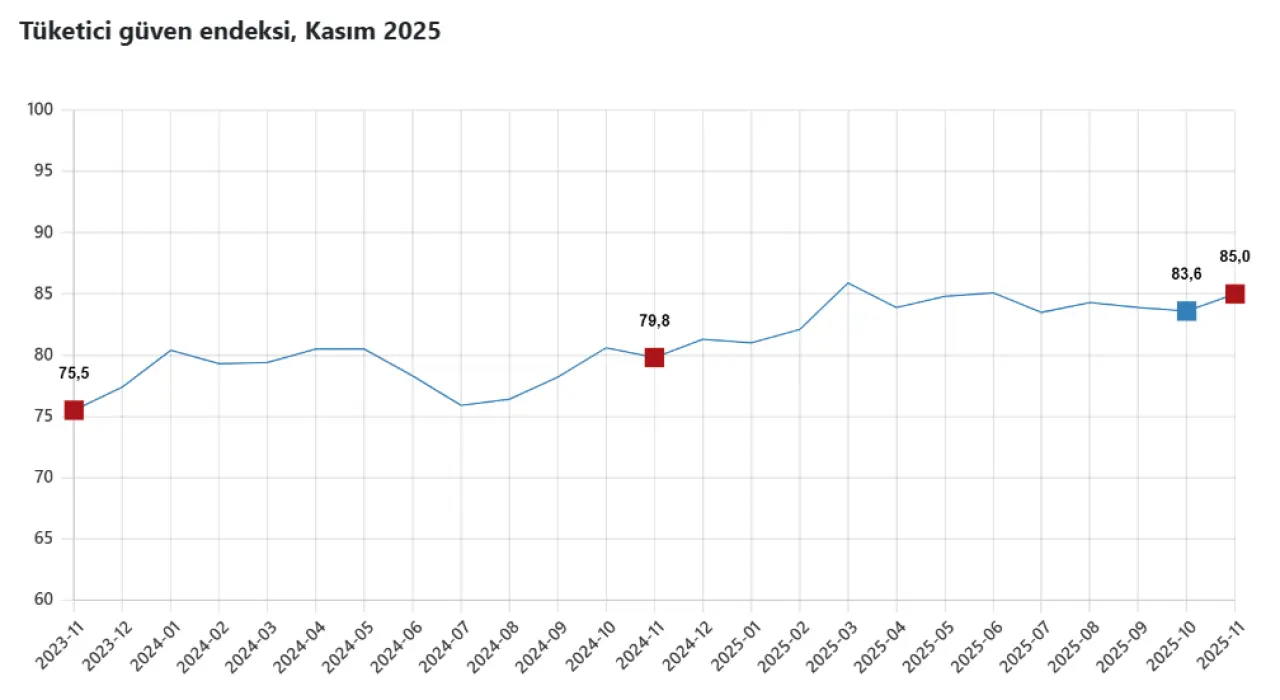 Tüketicilerin ekonomiye olan güveni yükselirken, endeks Ekim ayındaki 83,6 seviyesinden Kasım ayında yüzde 1,6'lık bir artışla 85,0'a ulaştı. Bu yükseliş, hanelerin mevcut maddi durumu ve gelecek beklentilerindeki iyileşmenin sinyalini veriyor.