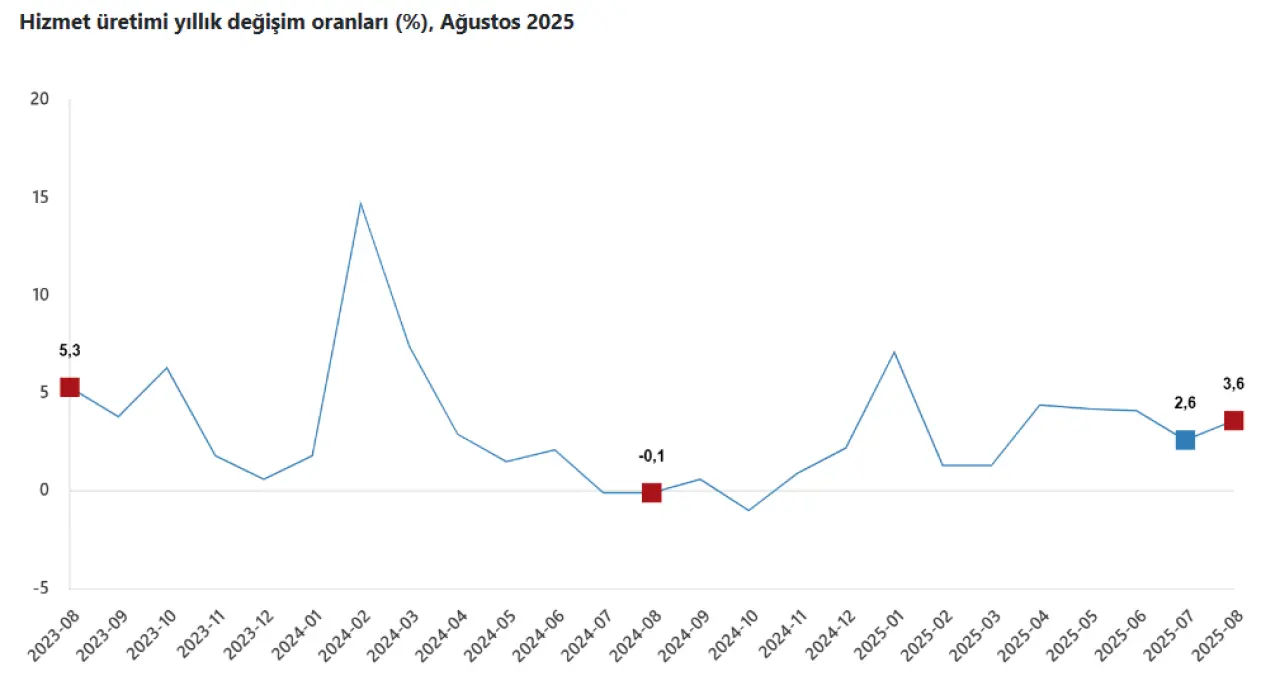 Türkiye ekonomisinin önemli bir göstergesi olan Hizmet Üretim Endeksi, 2025 yılı Ağustos ayı verileriyle sektördeki canlılığın devam ettiğini gösterdi. Türkiye İstatistik Kurumu (TÜİK) tarafından yayımlanan rapora göre takvim etkisinden arındırılmış endeks, bir önceki yılın aynı ayına göre yüzde 3,6 oranında artış kaydetti.
