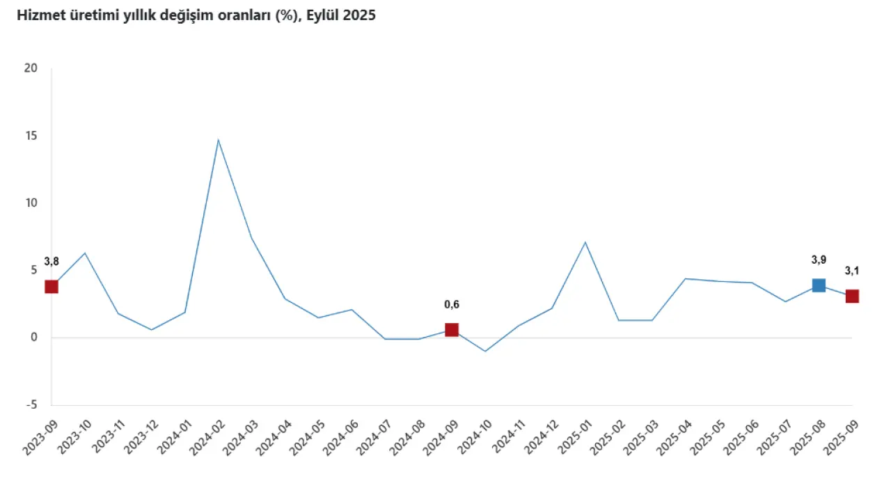 Hizmet Üretim Endeksi, Eylül 2025'te bir önceki aya (Ağustos 2025) göre ise yüzde 0,1 oranında azaldı.