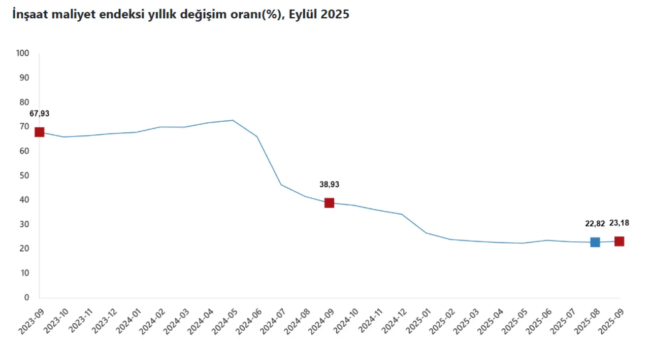 Türkiye İstatistik Kurumu (TÜİK) tarafından açıklanan Eylül 2025 İnşaat Maliyet Endeksi verileri, sektördeki maliyet artışının hız kesmediğini ortaya koydu. Genel İnşaat Maliyet Endeksi, bir önceki yılın aynı ayına göre yüzde 23,18 oranında artış kaydederken, aylık bazdaki yükseliş ise yüzde 0,87 oldu.