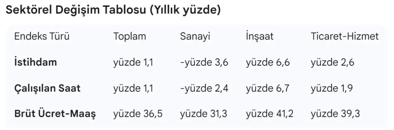 2025 yılı IV. çeyreğinde, sanayi, inşaat ve ticaret-hizmet sektörleri toplamında istihdam endeksi, bir önceki yılın aynı dönemine göre yüzde 1,1 oranında artış gösterdi. Sektörel bazda bakıldığında sanayi sektöründe yüzde 3,6’lık bir azalış yaşanırken; inşaat sektöründe yüzde 6,6, ticaret-hizmet sektörlerinde ise yüzde 2,6’lık artış kaydedildi.