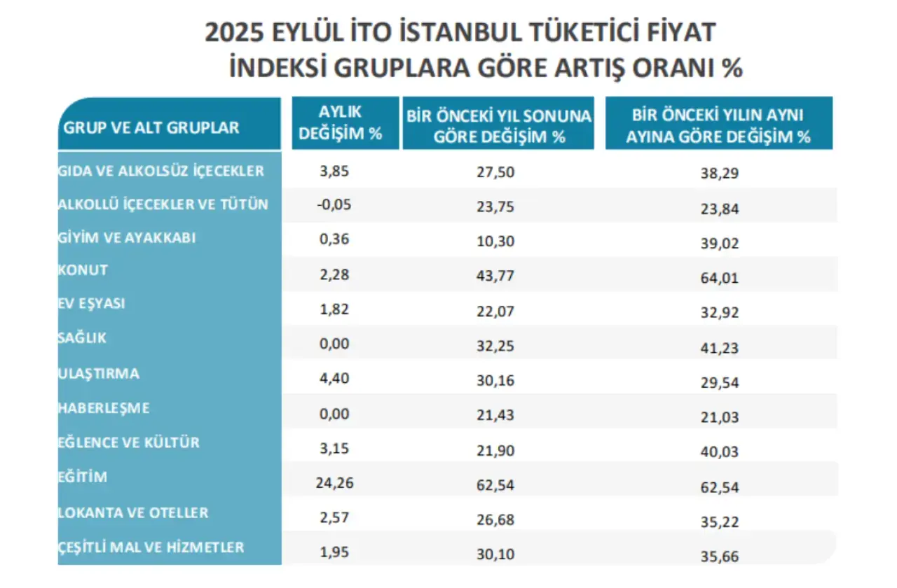 İTO'nun 2023=100 bazlı endeksine göre İstanbul'da bir önceki yılın aynı ayına (2024 Eylül) göre fiyat değişim oranı ise yüzde 40,75 seviyesine ulaştı. 2024 yılsonuna göre artış oranı ise yüzde 30,10 olarak belirlendi.