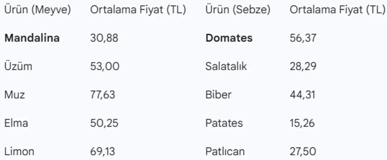 Hal verilerine göre en çok tercih edilen ürünlerin ortalama birim fiyatları (kilogram/adet) ise şu şekilde sıralandı:
