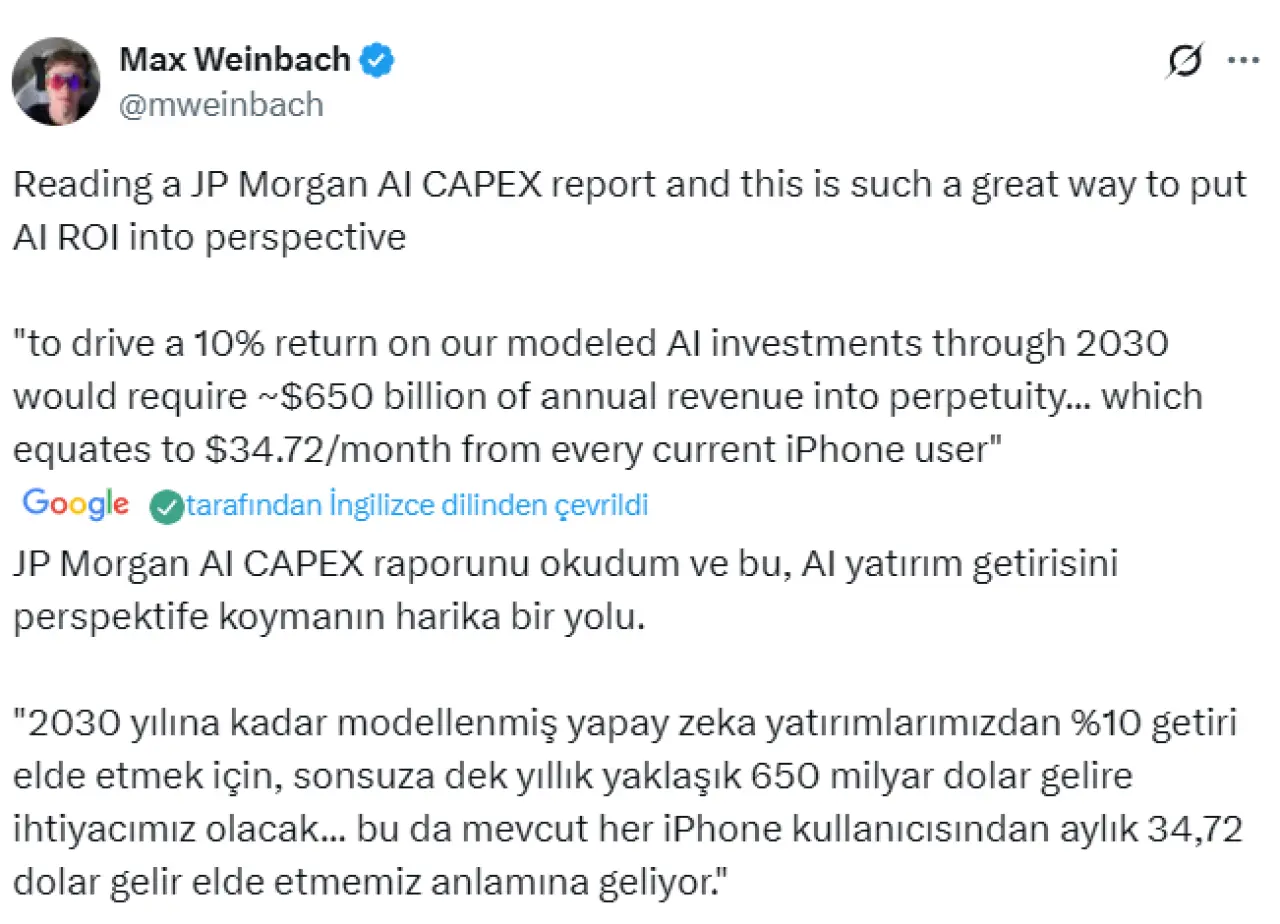 JPMorgan analisti Max Weinbach tarafından gündeme getirilen bu analiz, 650 milyar dolarlık eşiğin büyüklüğünü somutlaştırmak için çarpıcı bir karşılaştırma sunuyor. Bu gelir, kabaca şu senaryolara denk geliyor: