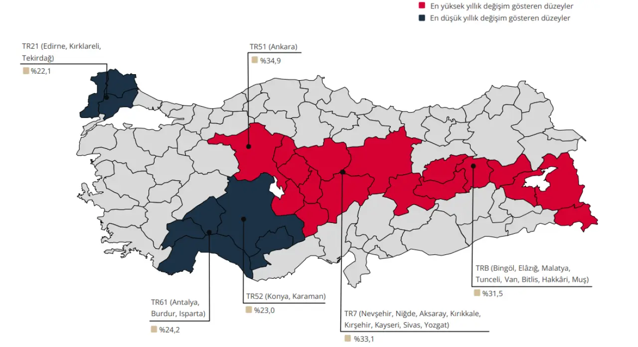 En düşük yıllık değişim ise yüzde 22,1 ile Edirne, Kırklareli ve Tekirdağ’ı kapsayan TR21 bölgesinde kaydedildi. Antalya, Burdur ve Isparta bölgesi de yüzde 24,2’lik artışla ortalamanın altında kalan diğer dikkat çekici bölgeler arasında yer aldı.