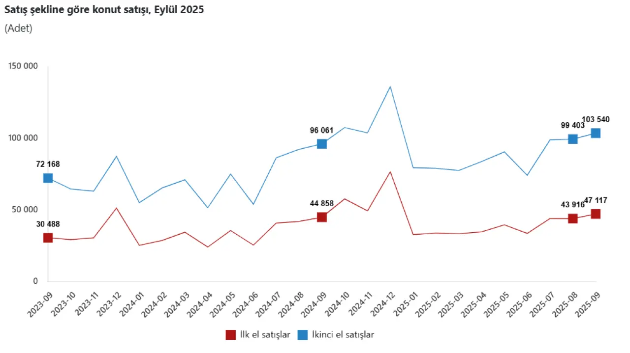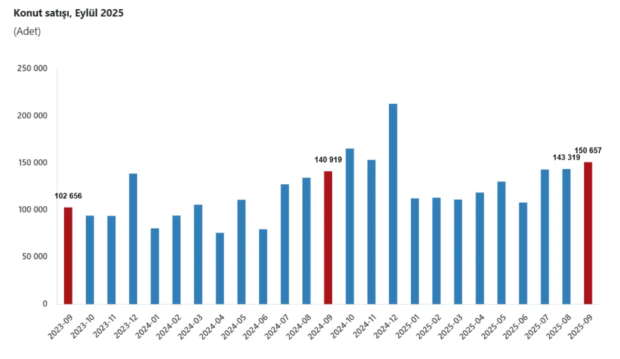 Türkiye İstatistik Kurumu (TÜİK) tarafından açıklanan Eylül 2025 verilerine göre Türkiye genelinde konut satışları geçtiğimiz yılın aynı ayına kıyasla yüzde 6,9 oranında artarak 150 bin 657 seviyesine ulaştı.