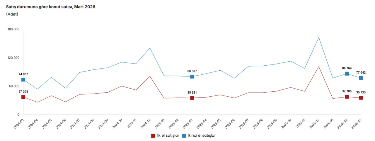 İlk El Konut Satışları: Geçen yılın aynı ayına göre yüzde 1,3 artışla 35 bin 725 oldu.
