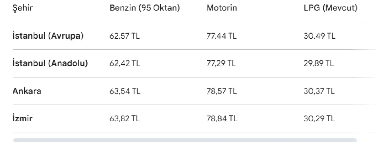 Zam öncesinde Türkiye genelindeki güncel akaryakıt satış fiyatları ise şu şekildedir: