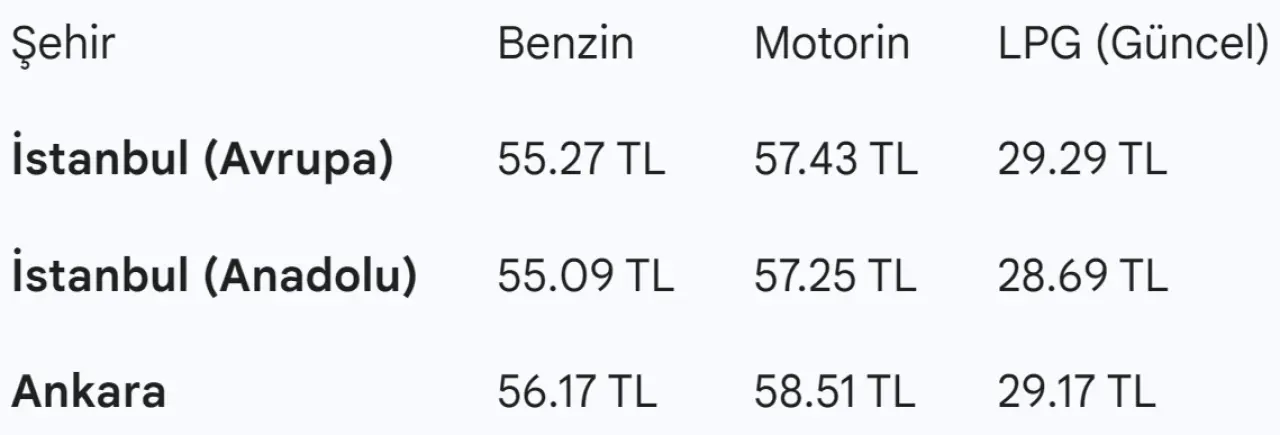 İstanbul (Avrupa): 29,29 TL olan litre fiyatı 30,03 TL seviyesine yükselecek.