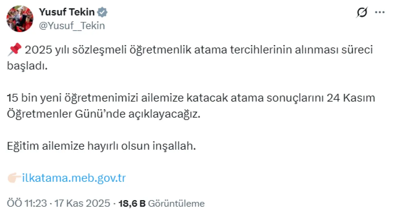 "2025 yılı sözleşmeli öğretmenlik atama tercihlerinin alınması süreci başladı. 15 bin yeni öğretmenimizi ailemize katacak atama sonuçlarını 24 Kasım Öğretmenler Günü’nde açıklayacağız. Eğitim ailemize hayırlı olsun inşallah."