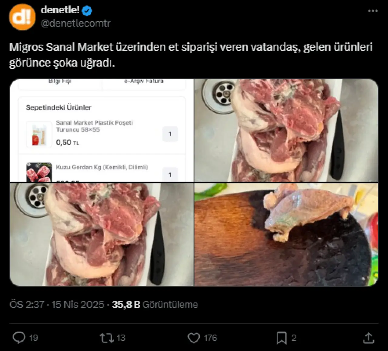 Siparişi veren vatandaş, sosyal medya hesabından yaptığı paylaşımda Migros’un kurumsal yapısına güvenerek alışveriş yaptığını belirtti. “Markete gidip seçme şansım olmadığı için online sipariş verdim ama gelen ürünler ne hijyenik ne de sağlıklı görünüyor” diyen kullanıcı, yaşadığı hayal kırıklığını açıkça dile getirdi. Görsellerin altında yer alan yorumlarda birçok kullanıcı benzer sorunlar yaşadığını ifade ederek Migros’a eleştiriler yöneltti.