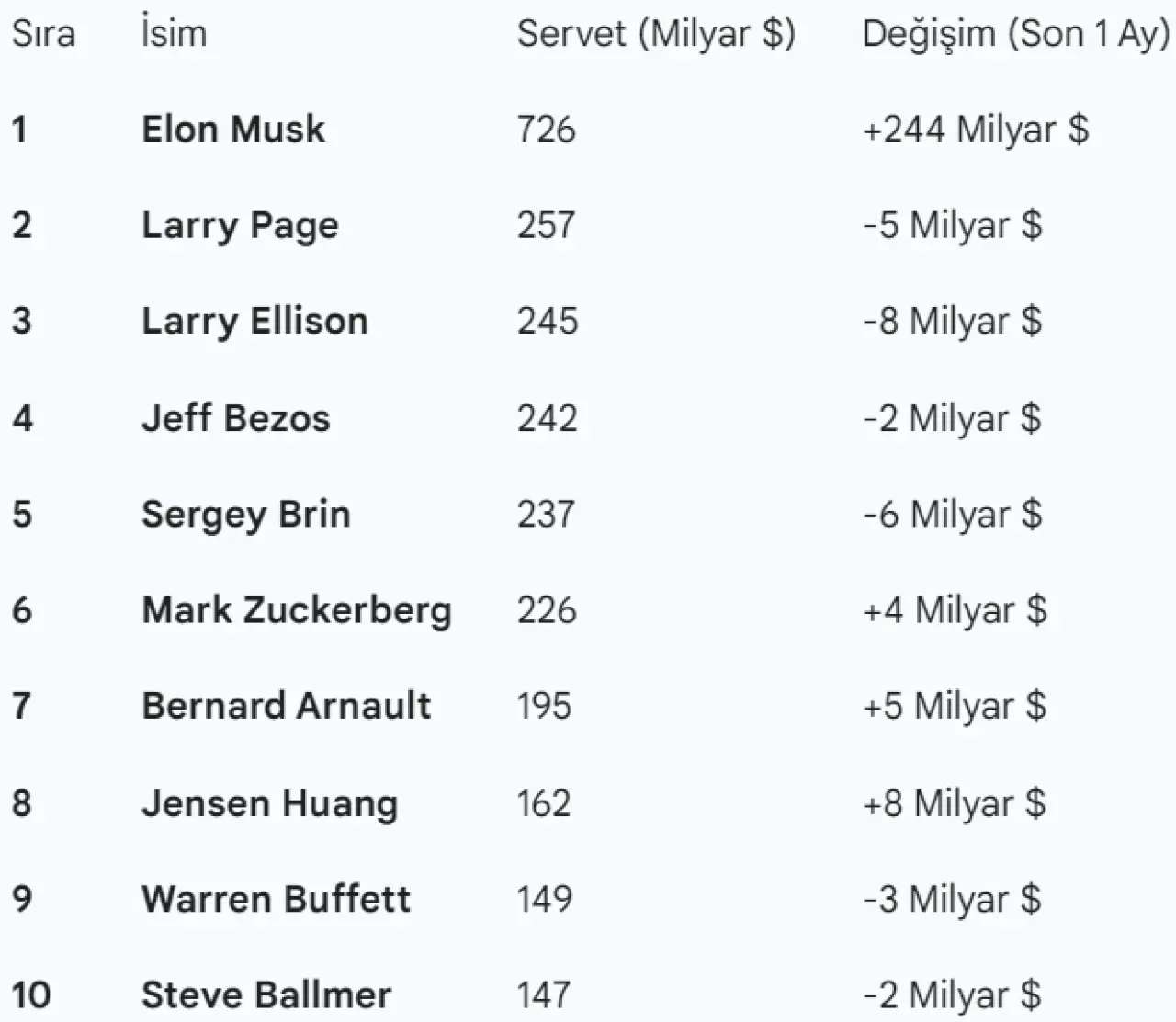 Listenin devamında ise sırasıyla Mark Zuckerberg (226 milyar $), Bernard Arnault (195 milyar $), Jensen Huang (162 milyar $), Warren Buffett (149 milyar $) ve Steve Ballmer (147 milyar $) bulunuyor.
