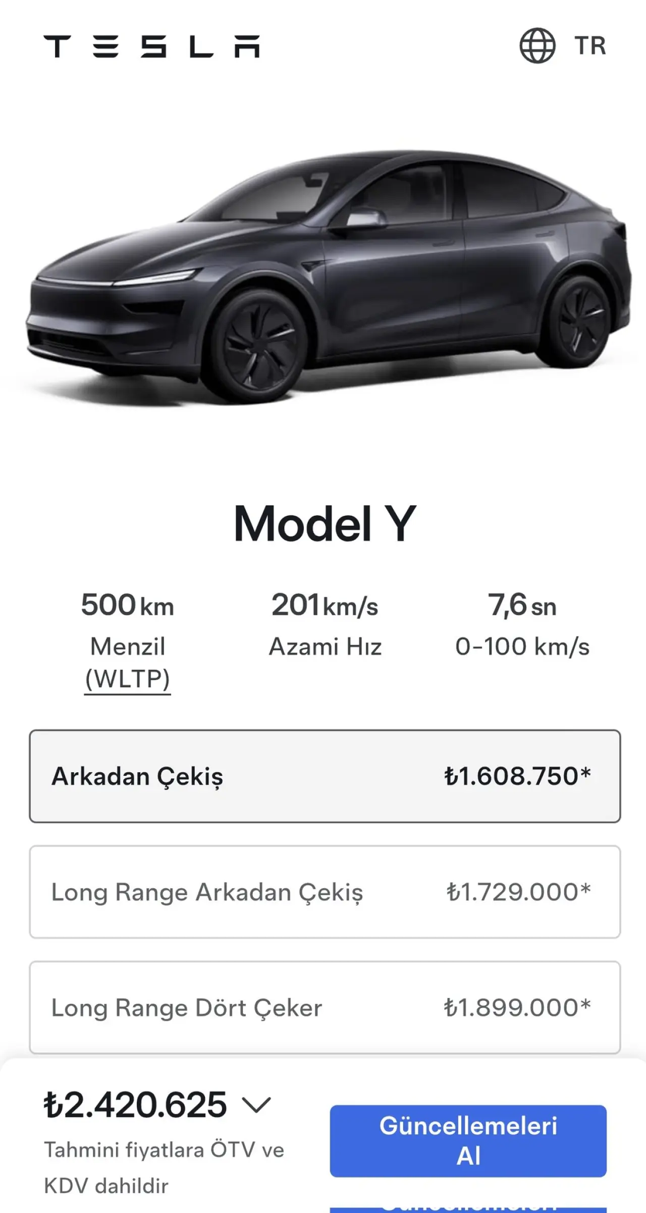Yapılan son güncellemeyle birlikte daha önce 2,3 milyon TL seviyelerinde olan Model Y'nin ÖTV ve KDV dahil yeni başlangıç fiyatı 2.420.625 TL'ye yükseldi. Ancak asıl şaşırtıcı gelişme, fiyat/performans dengesiyle Türkiye'de oldukça popüler olan ve LFP bataryasıyla dikkat çeken Standart Menzil versiyonunun üretimden kaldırılması oldu. Bu karar, Tesla'nın en ulaşılabilir modelini bekleyen potansiyel alıcılar için hayal kırıklığı yarattı.