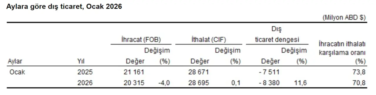 2026 yılı Ocak ayında ihracat, bir önceki yılın aynı ayına göre yüzde 4,0 azalarak 20 milyar 315 milyon dolar olarak gerçekleşti. Aynı dönemde ithalat ise yüzde 0,1 artışla 28 milyar 695 milyon dolar seviyesine yükseldi. Bu veriler ışığında, 2025 Ocak ayında yüzde 73,8 olan ihracatın ithalatı karşılama oranı, 2026 Ocak ayında yüzde 70,8'e geriledi.