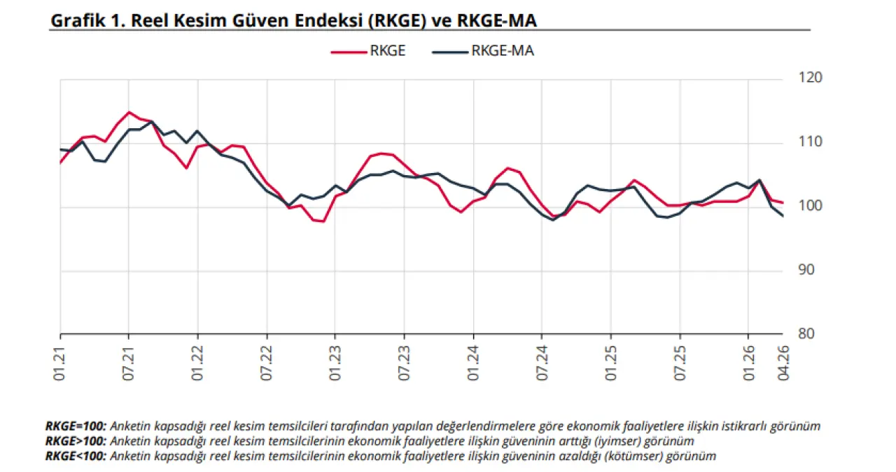 Nisan ayında mevsimsellikten arındırılmış Reel Kesim Güven Endeksi (RKGE-MA), bir önceki aya göre 1,4 puan azalarak 98,6 seviyesine geriledi. Endeksin 100 barajının altında kalması, reel kesim temsilcilerinin ekonomik faaliyetlere ilişkin "kötümser" bir görünüm içinde olduğunu gösteriyor.