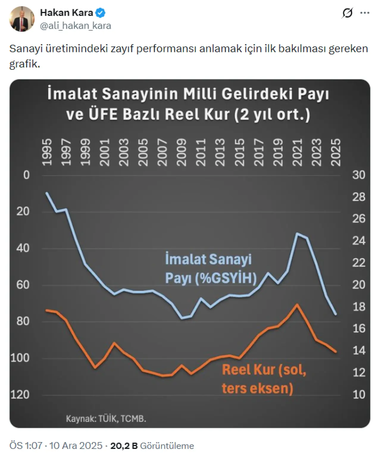 Bu durum, son dönemde yaşanan reel kur hareketlerinin, özellikle ihracat odaklı çalışan imalat sanayini doğrudan etkilediğini ve üretimdeki zayıflığın ekonomi politikalarıyla yakından ilişkili olduğunu ortaya koyuyor. Kara'nın grafiği, sanayi üretiminin sadece talep değil, aynı zamanda uluslararası rekabet gücüyle de ne kadar bağlantılı olduğunu açıkça gösterdi.