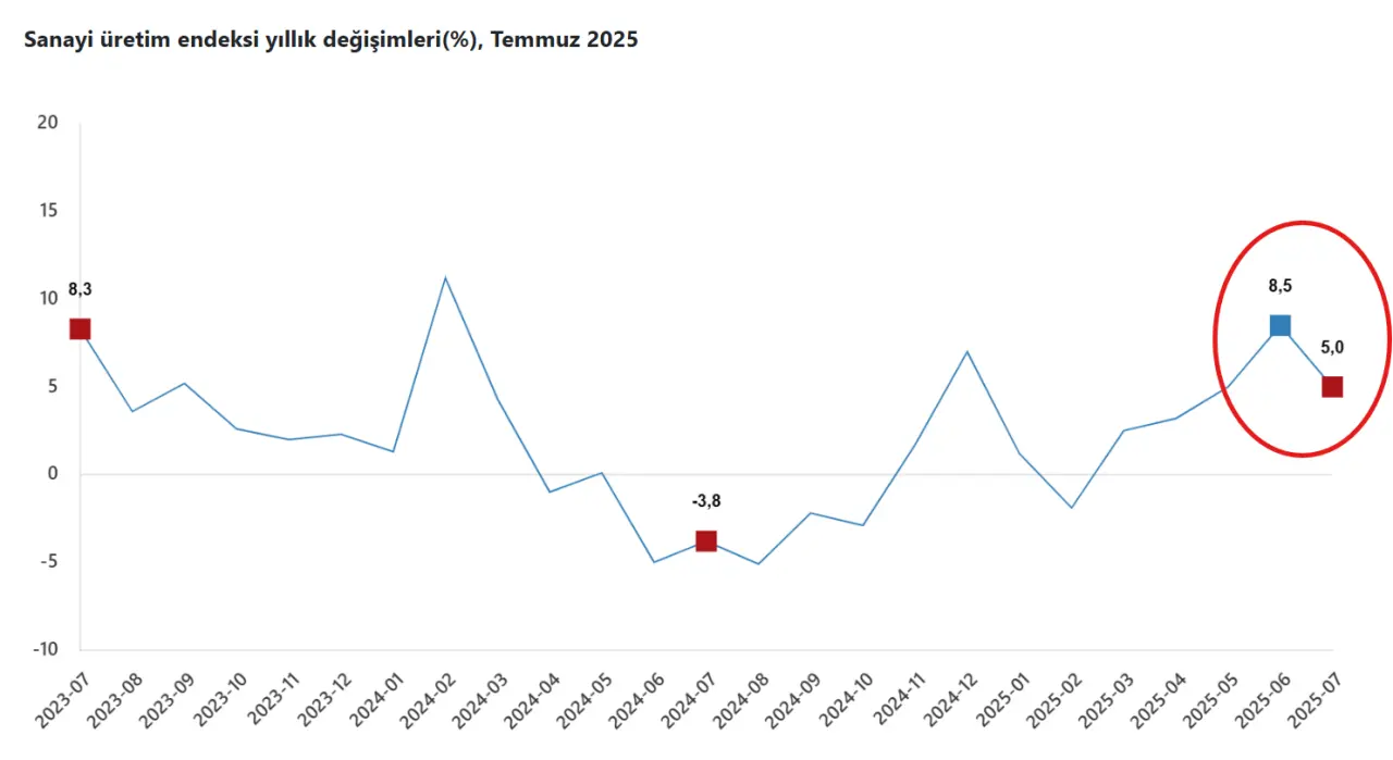 Türkiye İstatistik Kurumu (TÜİK) tarafından bugün açıklanan verilerine göre Temmuz 2025’te sanayi üretimi yıllık bazda yüzde 5 artış gösterdi. Aylık karşılaştırmada ise sanayi üretimi yüzde 1,8 azaldı.