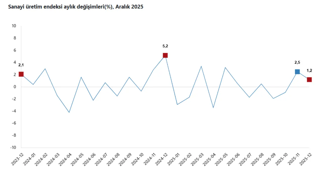 Türkiye İstatistik Kurumu (TÜİK), merakla beklenen Aralık 2025 Sanayi Üretim Endeksi verilerini paylaştı. Verilere göre sanayi üretimi yıllık bazda yüzde 2,1 oranında azalış gösterirken, aylık bazda yüzde 1,2’lik bir artış kaydetti. Ancak aylık bazdaki yükseliş bir önceki aydaki yüzde 2,5 oranındaki artışın gerisinde kaldı.