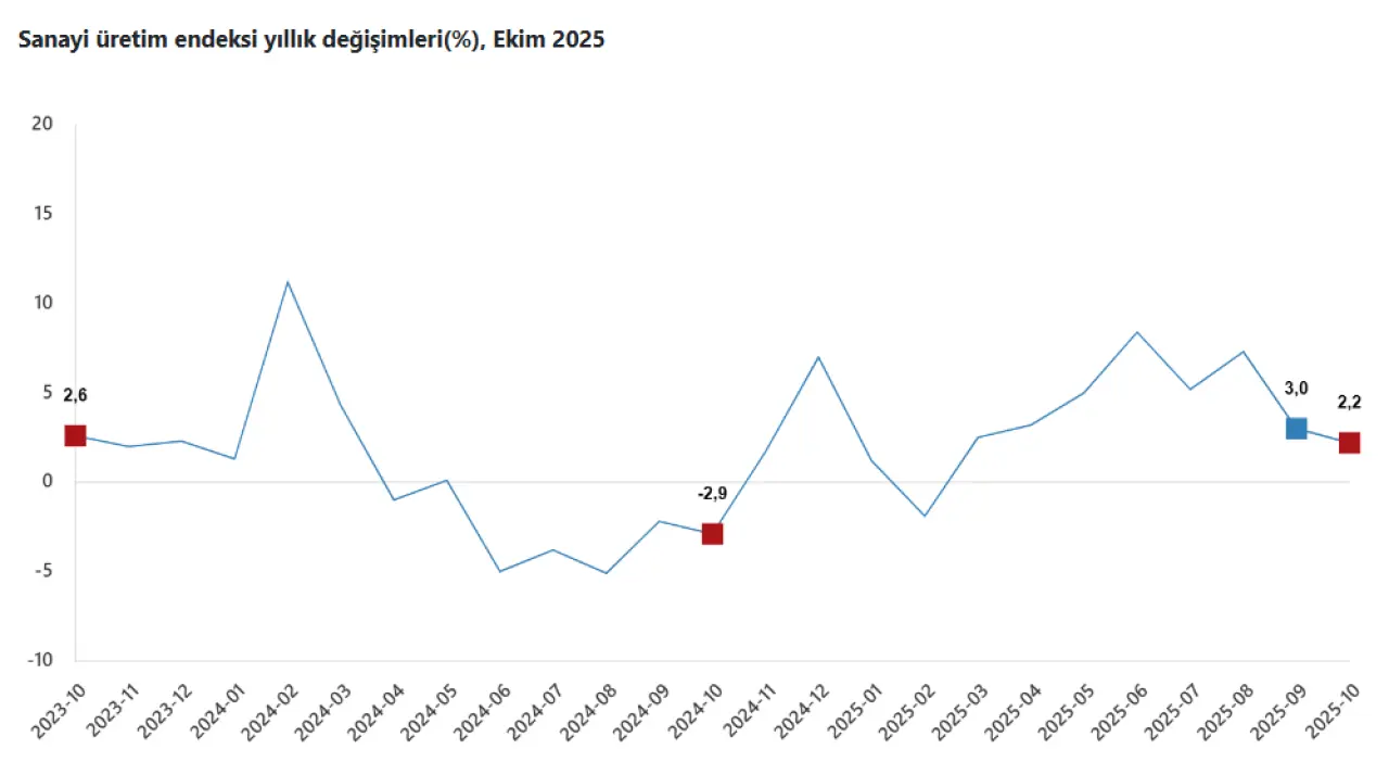 Türkiye İstatistik Kurumu (TÜİK), 2025 yılı Ekim ayına ilişkin Sanayi Üretim Endeksi verilerini kamuoyuyla paylaştı. Açıklanan verilere göre, sanayi üretimi bir önceki yılın aynı ayına kıyasla yüzde 2,2 oranında bir artış göstererek yıllık büyüme ivmesini sürdürdü.