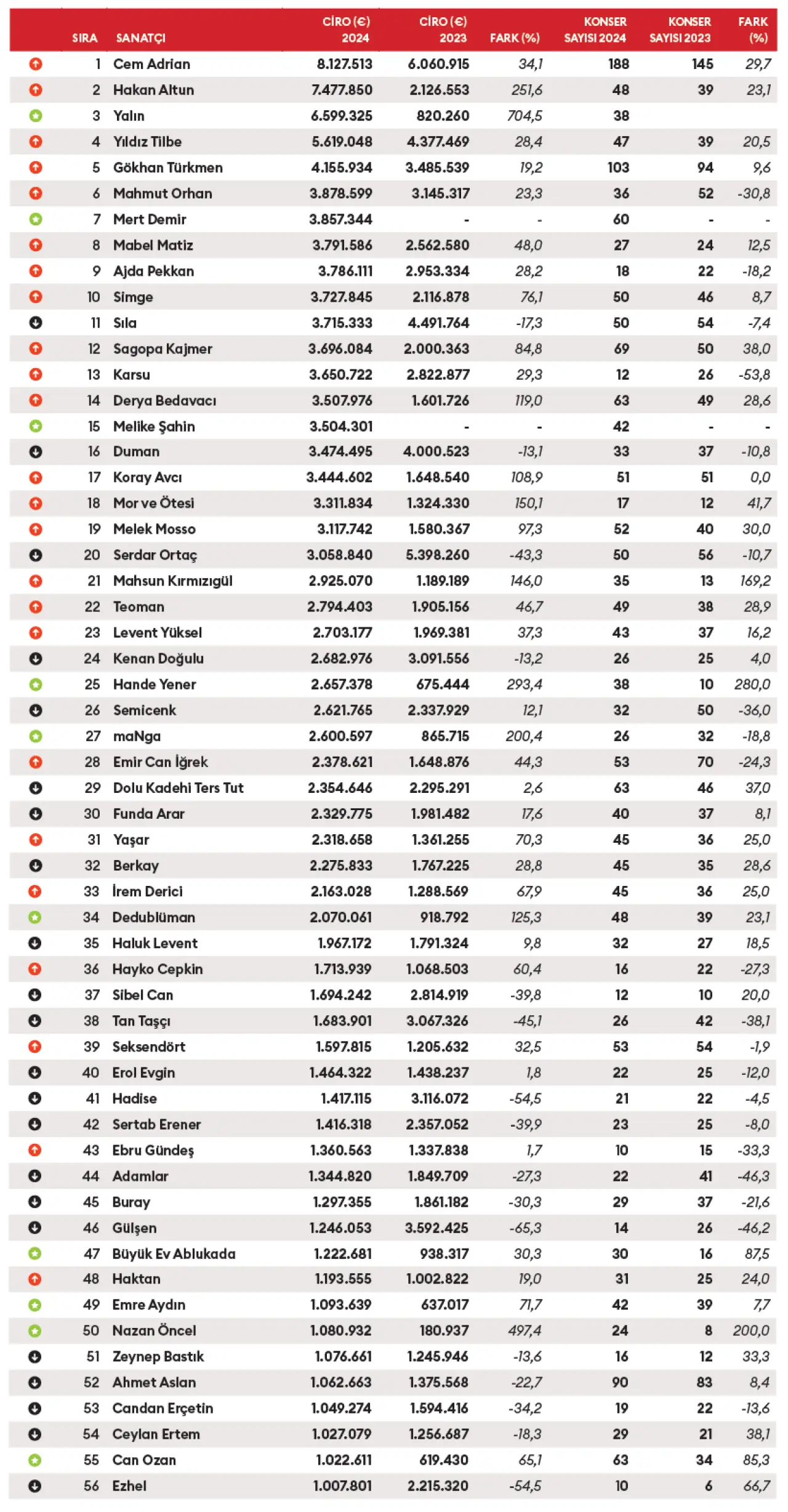 Cem Adrian 188 konserle zirveye otururken, Hakan Altun sadece 48 konserle ikinci sıraya yerleşerek bilet başına yüksek gelir elde eden isimlerden biri oldu. Yalın ise cirosunu %704,5 oranında artırarak büyük bir sıçrama yaptı.