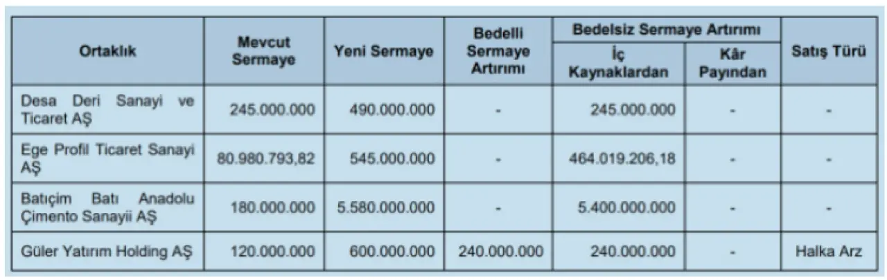 Batıçim Batı Anadolu Çimento Sanayii AŞ (BTCIM), %3000 bedelsiz sermaye artırımı için SPK'dan onay aldı. Güler Yatırım Holding AŞ (GLRYH), %200 bedelsiz ve %200 bedelli sermaye artırımlarına SPK'dan onay aldı. Verilen izinlerin ayrıntıları, yayımlanan bültenin detaylarında yer almaktadır.